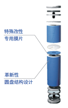 其核心結(jié)構(gòu)為特殊改性的專用膜片和革新性導(dǎo)流盤,膜片與導(dǎo)流盤的間歇部分為進(jìn)水的敞開式通道,導(dǎo)流盤上的凹槽是滲透水的流道。