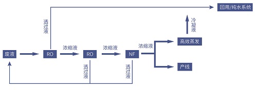 膜法濃縮技術優于傳統離子交換工藝,其濃縮效率高,出水水質好,濃縮液和透過也均可回用。處理后出水可回用到生產工序中,金屬的回收率能達到99%以上,基本實現零排放。